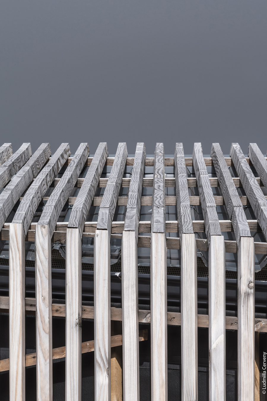 L’objectif, dès l’acceptation de l’esquisse et du concept du monolithe par les clients, était de valider la vêture de cette extension en ossature bois. Le mode constructif de l’extension s’est vite imposé, sa vêture, quant à elle a demandé une étude plus poussée et une validation tant esthétique, constructive et économique par la réalisation d’un prototype échelle 1 avec l’entreprise Lys Construction Bois de Dompierre. Véritable travail en partenariat, avant d’aller plus loin dans les études du projet, nous souhaitions avoir les garanties de la faisabilité de celui-ci : techniquement dans son étanchéité à l’air et à l’eau, dans ce bardage trapézoïdale à claire voie en douglas se retournant de la toiture en mur (une continuité parfaite du bardage dissimulant l’égout et les descentes d’eau).