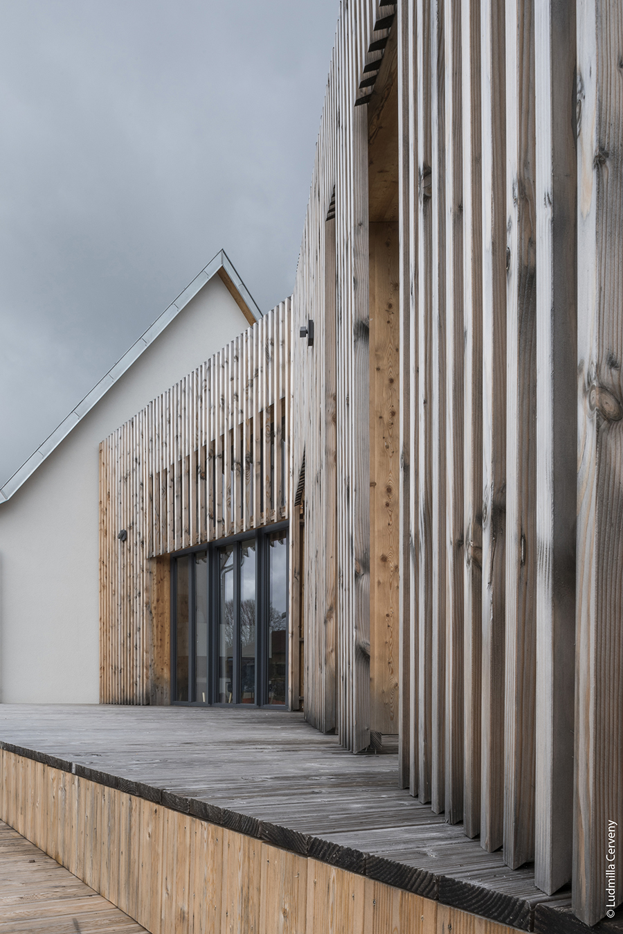 La recherche sur la vêture a abouti à valoriser les resources locales et à privilégier le douglas vosgien. Fuseau filant du pied de façade au faîtage, la complexité de l’angle a été étudié et modélisé par le BET structure D-Bois. Le bardage en trapèze sur les parties courantes (toiture et façade Nord) se trouvent être totalement déformé sur les 2 façades biaises exposées Sud, non parallèle au faîtage. Comme la vêture, les aménagements extérieurs sont issus des ressources locales. Les terrasses et clôtures sont en douglas vosgien.